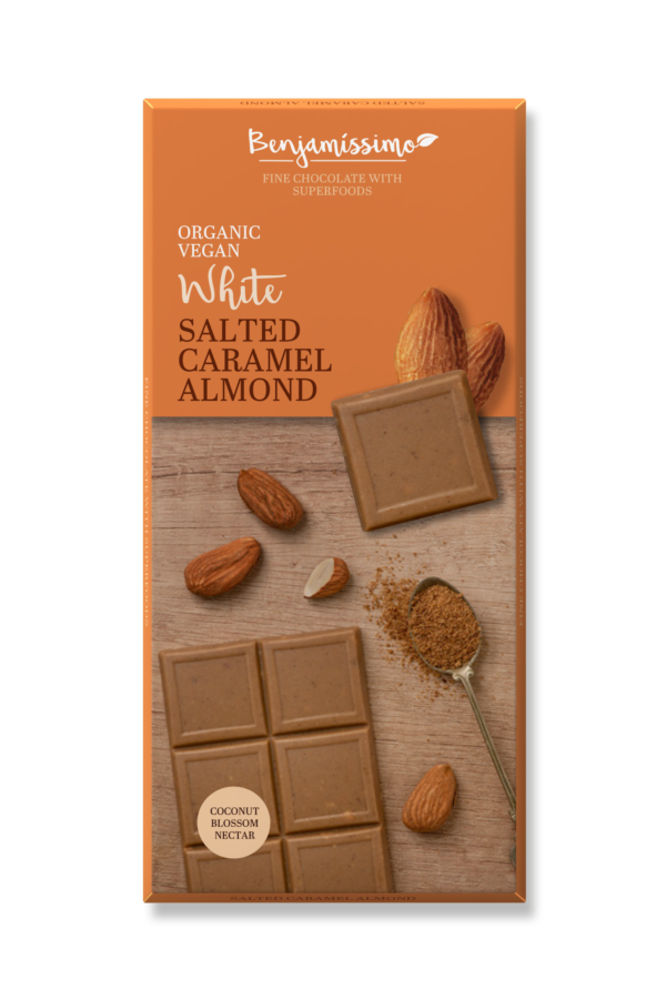 A unique chocolate experience – a tasty vegan alternative for white chocolate with freshly roasted almonds, sweetened with a special coconut blossom nectar, which gives it the distinctive colour and nice caramel taste.
