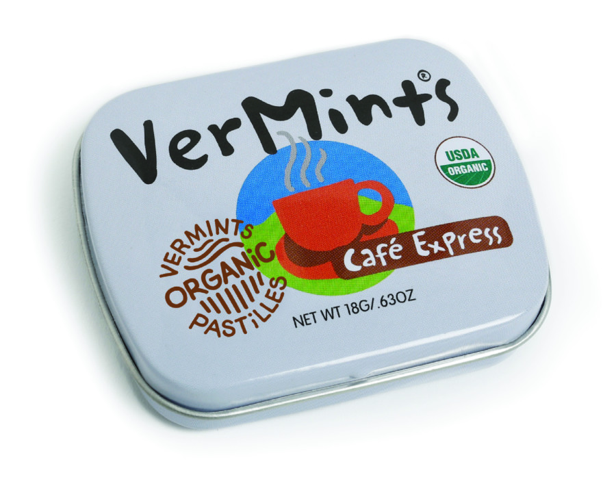 Get a swift java kick without the paper cup and teeth stains. VerMints Organic Café Express is a sweet and delightful pastille that is sinfully candy-like and unequivocally nice to your breath. INGREDIENTS : Organic Crystallized Cane Sugar, Organic Tapioca Syrup, Natural Flavoring, Organic Maple Syrup, Organic Fair Trade Coffee, Agar, Gum Tragacanth