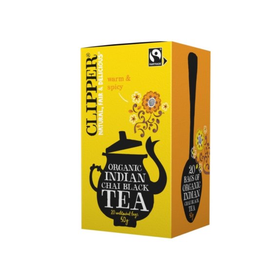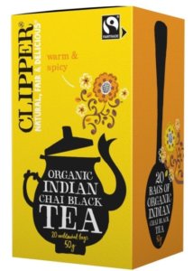 Deliciously refreshing, aromatic and rich Clipper Organic Indian Chai Black Tea – black tea from the finest Fair Trade organic tea farms combined with Indian Chai spices. Blended and packaged at the Clipper tea factory in southern England.