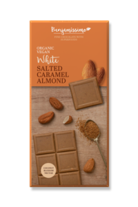 שוקולד לבן טבעוני אורגני עם שקדים וכרמל מלוח -
